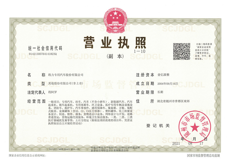 程力最新營業執照,程力專用汽車股份有限公司營業執照,程力新版營業執照,湖北程力汽車營業執照程力汽車官網:www.hfchl.com,程力專汽政府和事業單位專用汽車…